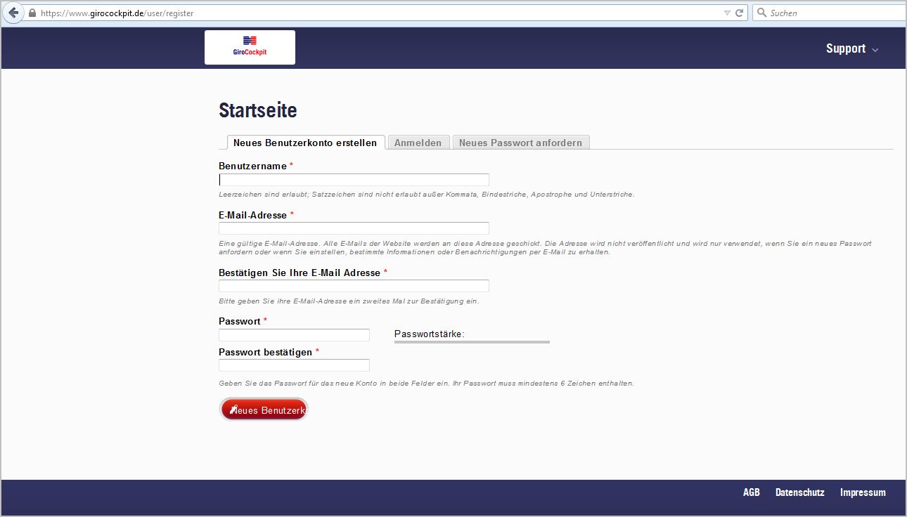 You don´t have an user account for our GiroCockpit, but you would like to have one? In this chapter you find a step by step guidance for creating a new user account.