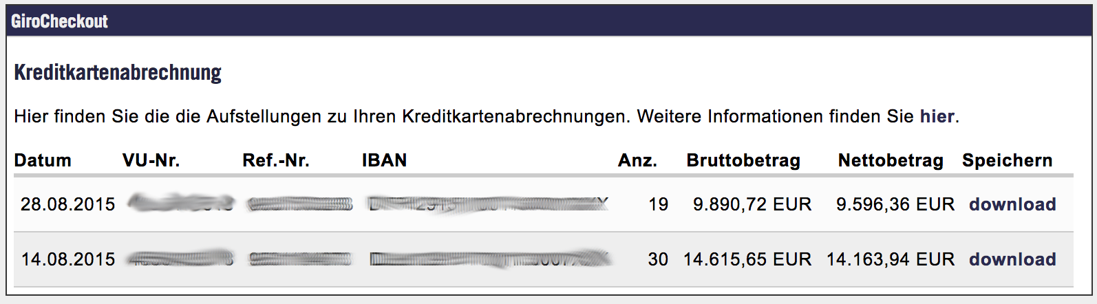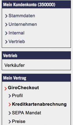 Es ist nun möglich, im GiroCockpit die detaillierte Aufstellung zu Kreditkartenrechnung abzurufen. Sie finden diese Option in Ihrem GiroCockpit im Bereich „Mein Vertrag“ > GiroCheckout, in der linken Spalte Ihres Cockpits: