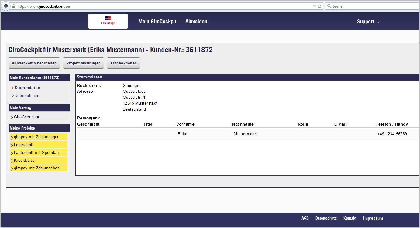 Die Unterkategorie „Stammdaten“ gibt Ihnen einen Gesamtüberblick zu Ihrem Unternehmen. Insbesondere sind hier die Adress- und Kommunikations Daten wie die Rechtsform, die Anschrift Ihres Unternehmens, sowie der Name, die Rolle, die E-Mail-Adresse sowie die Telefonnummer aller beteiligten Personen hinterlegt.