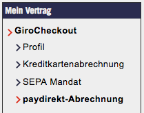 Wenn Sie paydirekt-Zahlungen entgegennehmen, haben Sie im GiroCockpit die Möglichkeit, die detaillierte Aufstellung zur paydirekt-Rechnung abzurufen. Sie finden diese Option in Ihrem GiroCockpit im Bereich „Mein Vertrag“ > GiroCheckout, in der linken Spalte Ihres Cockpits: