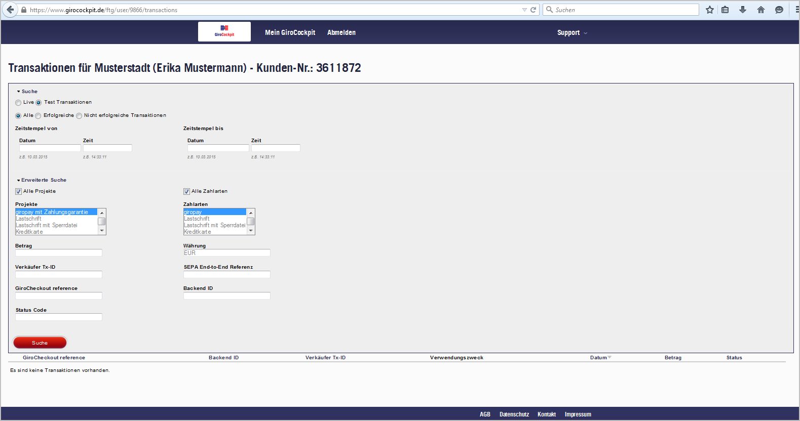Weitere Möglichkeiten zur Filterung der Transaktionen nach der GiroCheckout reference, dem Status Code, der Währung, der SEPA End-to-End Referenz sowie der Backend ID stehen Ihnen als Kunde in der Erweiterten Suche zur Verfügung.
